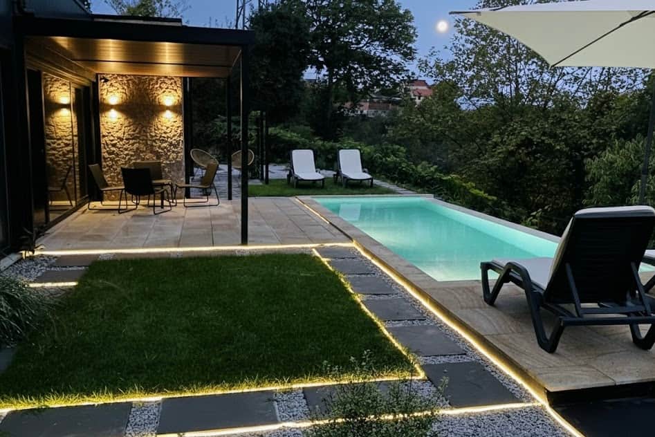 Integrated walkways lighting for evening ambiance. The soft glow from the pool and the warm wall-mounted fixtures on the Villa's stone exterior create an inviting atmosphere for evening relaxation on the sun loungers Or in the sheltered outdoor seating area. A calm spot to unwind while the mountain air stays still and quite around the property.